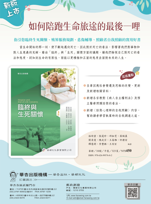 Chapter 1 死亡焦慮與死亡教育Chapter 2 臨終生理的變化與需求Chapter 3 臨終心理與社會需求Chapter 4 臨終的靈性需求Chapter 5 面對臨終者之溝通技巧Chapter 6 臨終的安排Chapter 7 臨終關懷的倫理議題Chapter 8 佛教的生死觀與喪葬禮俗Chapter 9 道教與民間信仰的生死觀與喪葬禮俗Chapter 10 基督宗教的生死觀與喪葬禮俗Chapter 11 殯葬服務的規劃Chapter 12 失落、悲傷與悲傷輔導Chapter 13 照顧者的壓力與調適